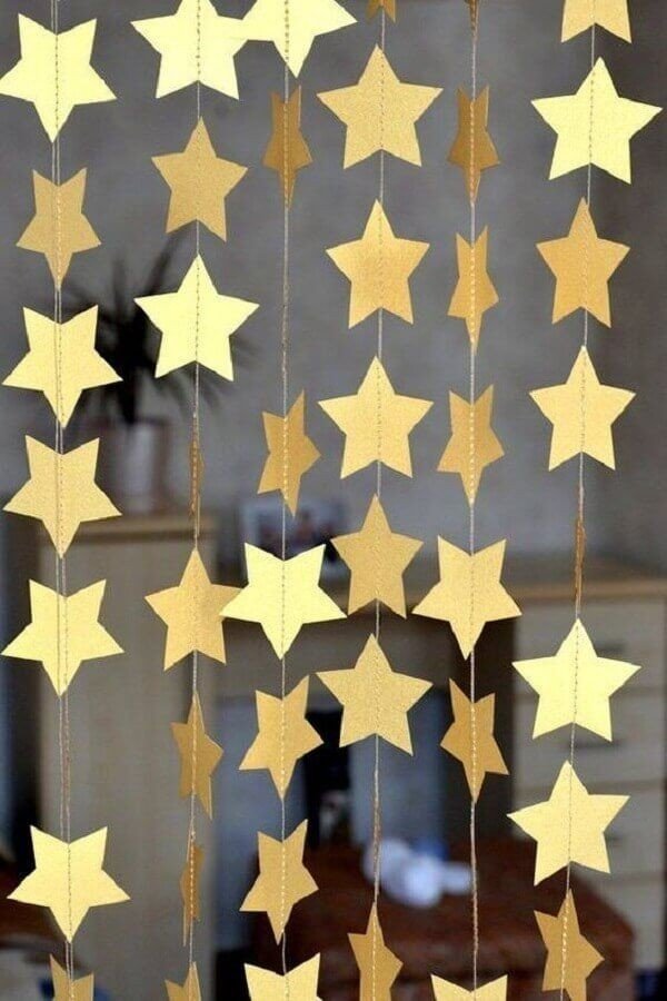 Investir nos balões são sempre uma boa, o que vai diferenciar é a escolha da cor e do tipo de material do balão, opte pelas cores brancas, prateadas e douradas, e procure deixar os balões fixados por fitilhos de cetim da mesma cor, mescle os balões no ambiente com luzes, taças e outras louças que possam compor um cenário bonito, bandeirinhas com papel brilhante e com glitter podem trazer um grande diferencial, e se você quiser arriscar, também pode utilizar esses cartões para escrever o ano, e outras palavras como: paz, amor, sucesso! E você também pode fazer estrelinhas com esses papéis, ou já comprar prontas, essa cortina de estrelas fica um verdadeiro charme!