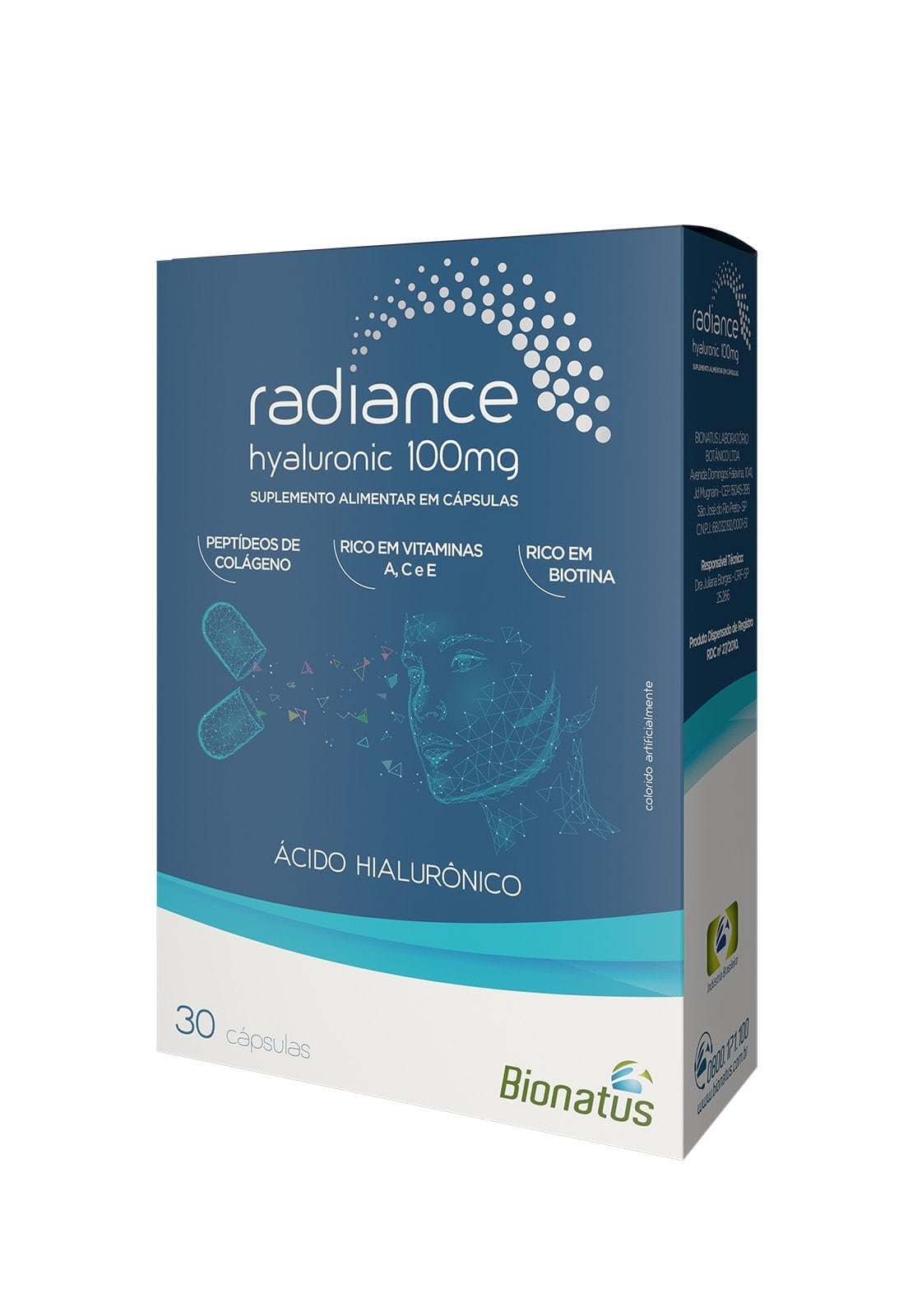 O segundo produto que vem me surpreendendo, tem um resultado mais demorado para aparecer, pois se tratam de cápsulas, esse produto é da marca Bionatus e ele se chama Radiance Hyaluronic (100 mg).