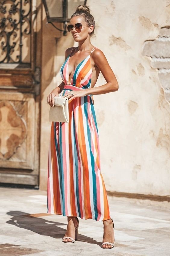 Para quem vai para festas, pode optar por uma gama diferente de looks, quem prefere roupa justa mas não quer exagerar na escolha, pode apostar nas saias “engana mamãe”, que trazem transparência para o alongamento das pernas, tornando um look versátil, porém sem deixar a sensualidade de lado, os cropeds estruturados são uma boa soma, outra opção são os wrapdress brilhantes ou de paete. Também pode apostar nos vestidos longos com detalhes nas costas e nas mangas, quem quiser ousar e também usar uma trend de 2020 pode apostar nas listras, e somar com uma bolsa de palha ou algum acessório rústico!