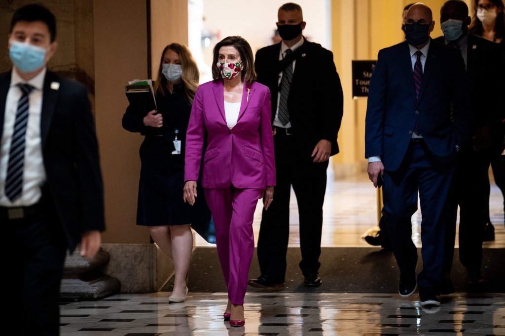 Pelosi subiu ao pódio para uma coletiva de imprensa em um vestido preto com uma máscara facial verde-esverdeada e branca, com estampa de folhagem – que não demorou muito para aparecer em um terninho rosa com uma máscara rosa-concha combinando.